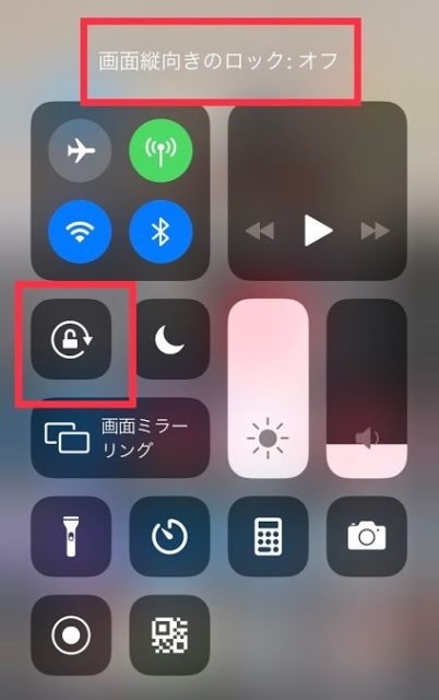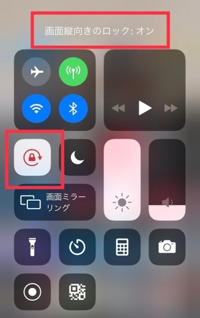 回転をロックした状態。上にはロック:オンと表示され、下の回転マークは白く表示されいます。この下の回転ロックをタップするとこうなります。