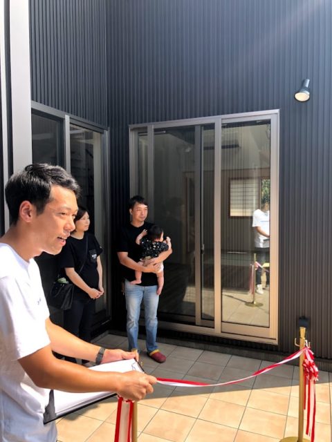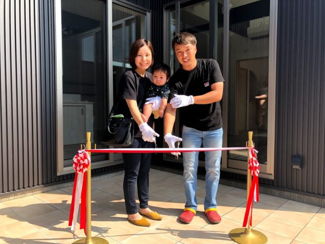その後、T様ご夫婦それぞれから一言を頂いて、「いや〜喜んでいただけて本当に良かった^^」と実感しながら、これから新しい家で過ごす門出を祝うテープカットへ。