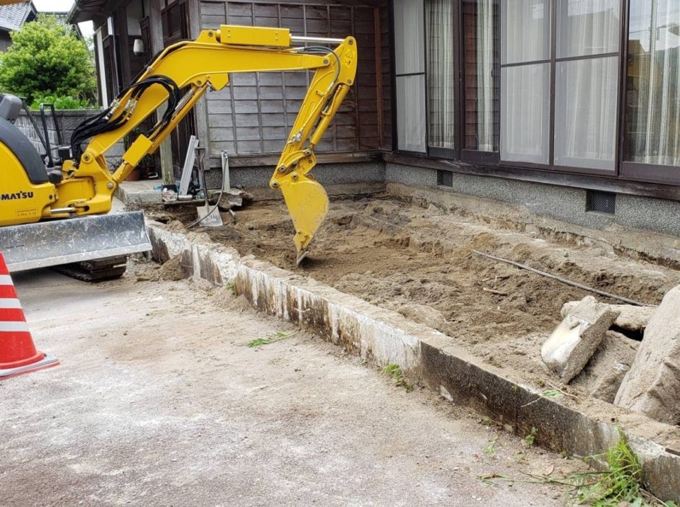 重機を乗り入れる為に道路沿いにあった境界ブロックの撤去からスタート