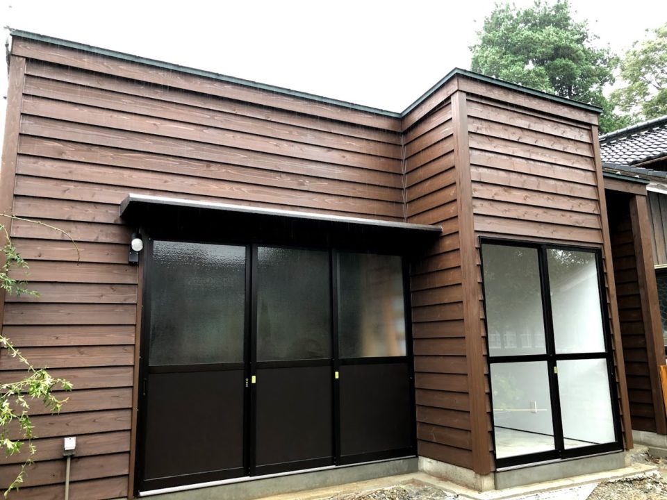 杉の下見板にウォルナットの木材保護剤(キシラデコール)が塗られた山小屋チックな外観。