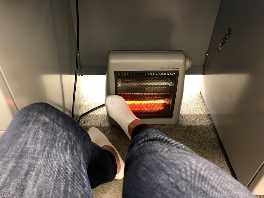 あまりにも痛いので足元ヒーターで患部を暖めてました