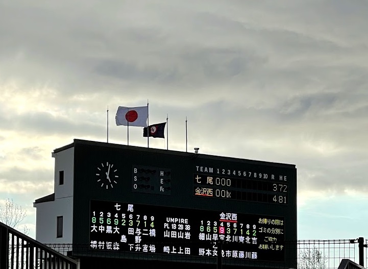 9回裏1死まで七尾高校がリードしていたのですが、なんと同点に追いつかれて延長戦に。。。そして気温もドンドン下がってきて12℃くらいに。。。