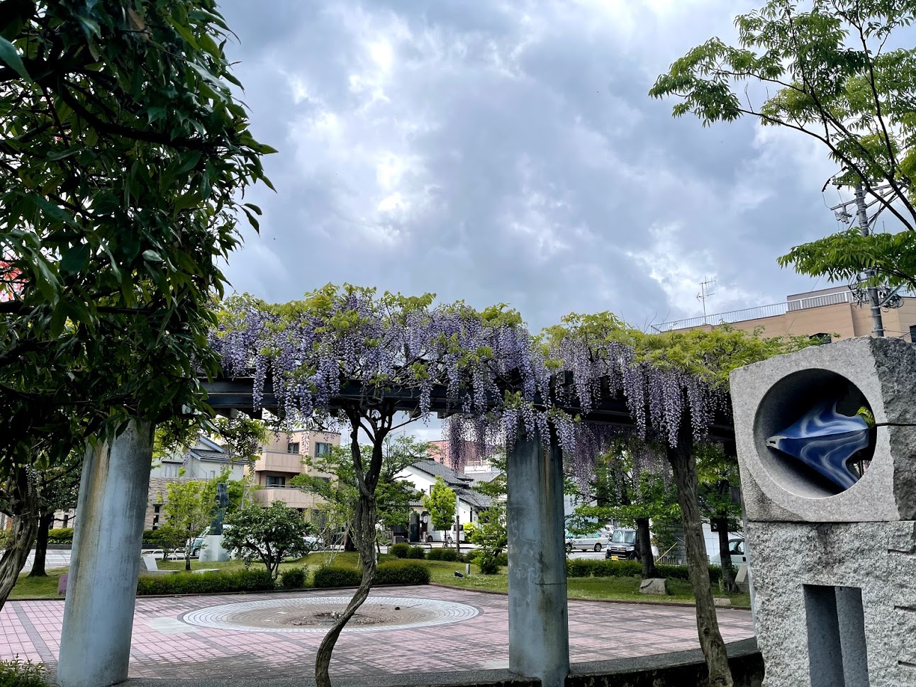 土地を見てきたあとに水道関係がどうなっているのかの確認で市役所へ。市役所向かいにある公園には藤の花が綺麗に咲いていました♪