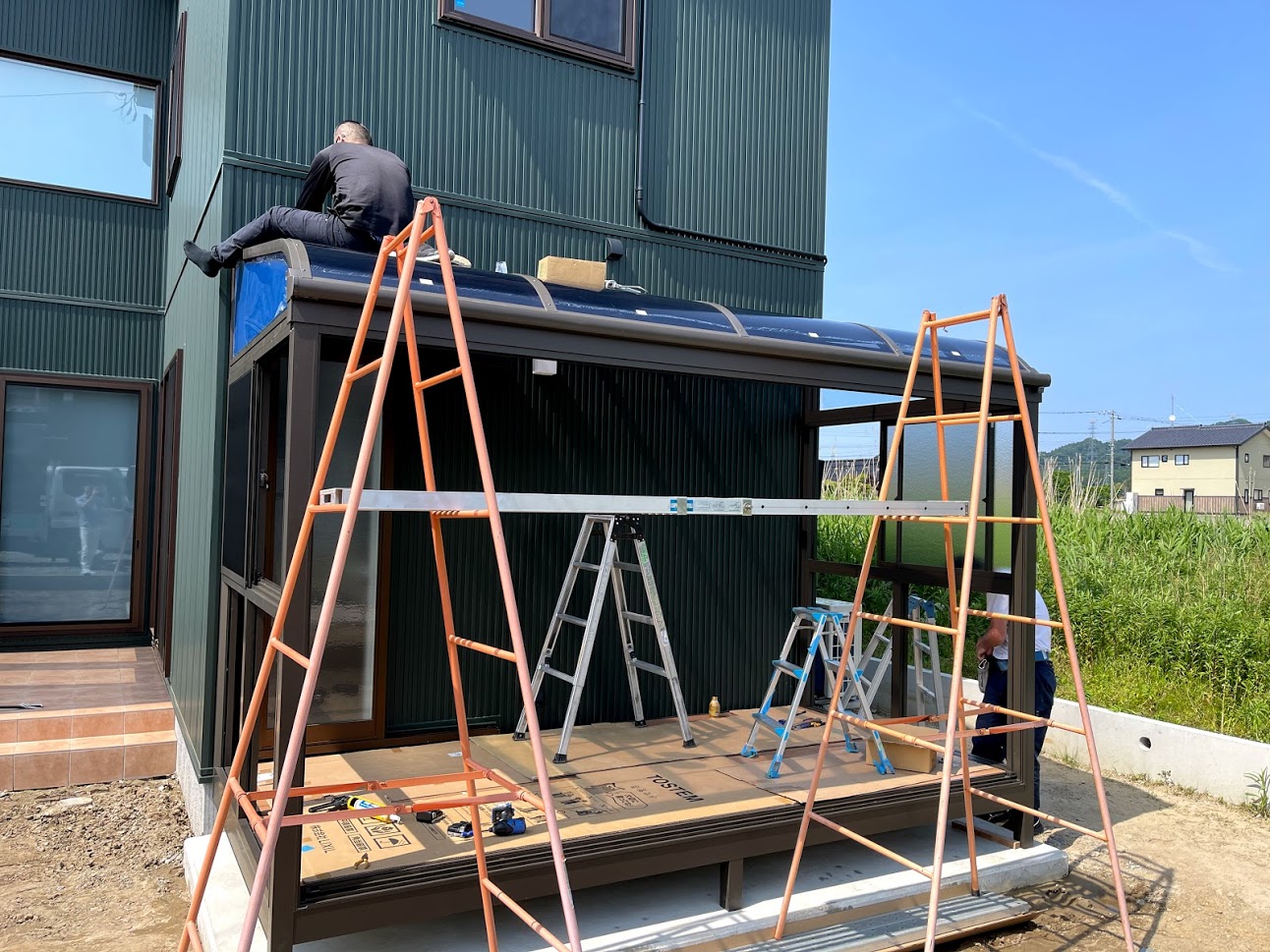 写真を撮りに行くといつもお世話になっている施工業者さんがサンルームの設置をしていました。