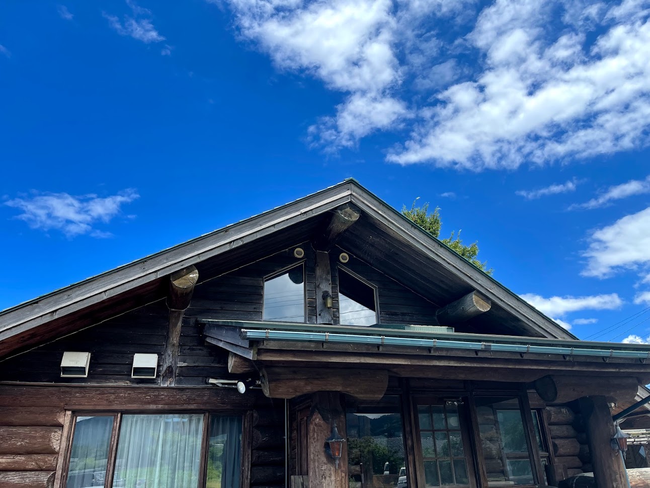 立派なログハウスと青い空