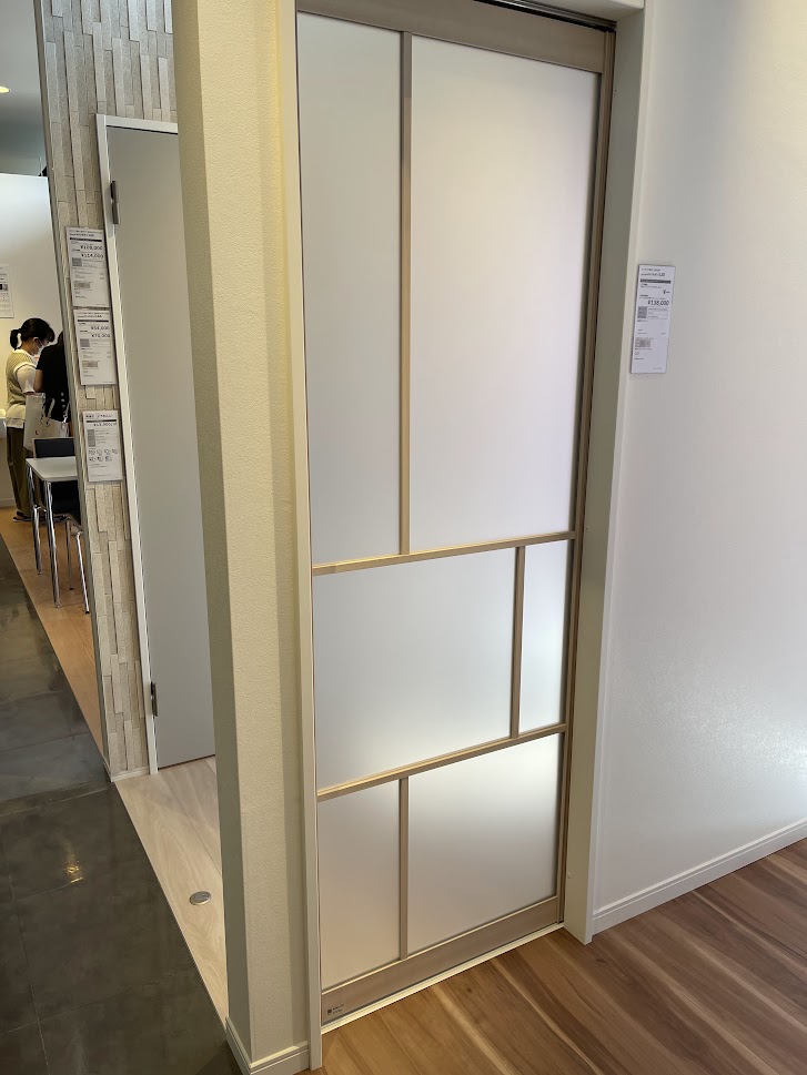 おっ!お洒落なドアがある!と発見したのは新商品の ラシッサDキナリモダン でした。和室の建具で使ってみたいですね~♪