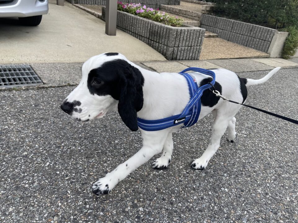 新しいハーネスを購入してご機嫌な飼い主とあまり気にしてない犬。笑