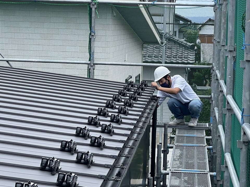 隣家への落雪を回避できるように業者さんが気を効かせて雪止めを多くつけてくれたようです^^(屋根の上に乗っている黒いのが雪止め)