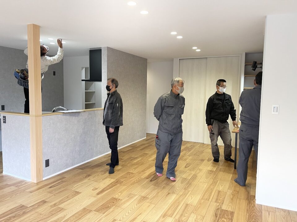 完成検査の前には営業スタッフに向けてお客様のこだわりと施した工夫について説明しました。担当外の現場って見学会の時にお客様にどんな想いでこのような間取りにしたのかを説明できない事もあるし、先にこういった事も伝えておけばご見学下さった方も「なるほど~」って思ってくれますもんね^^