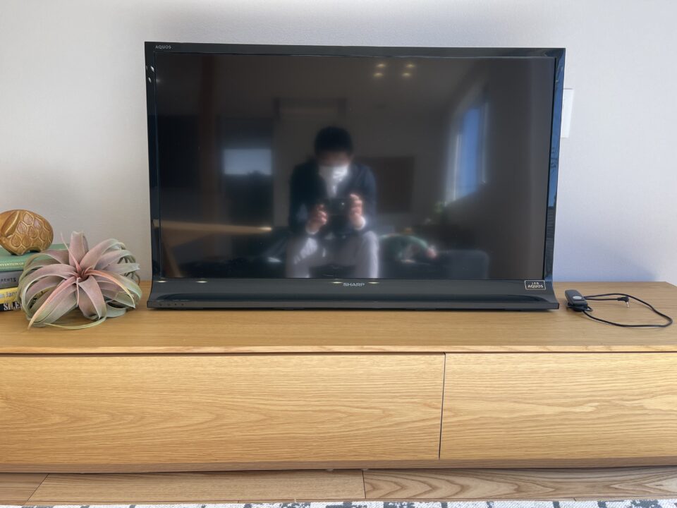 ソファに座ってお客様をお待ちしている際、テレビに映った自分が面白くて記念撮影。笑