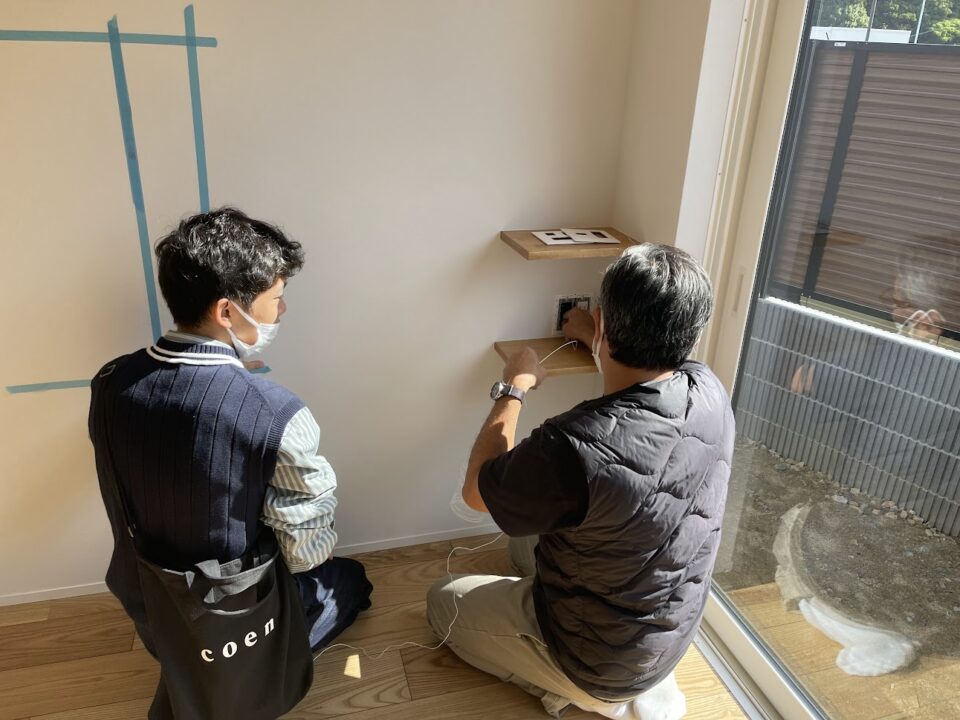 お客様に説明を聞いていただいている一方で応援スタッフは壁掛けテレビの下準備をしてくれました。写真は壁の中に仕込まれている配管に道糸を通してくれているところ^^