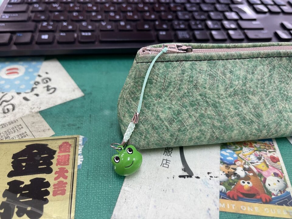 気分転換に蛙のキーホルダーをつけました。チリンチリンとうるさいけど、可愛いし、弊社のマスコットキャラクターでもあるで良いとします◎
