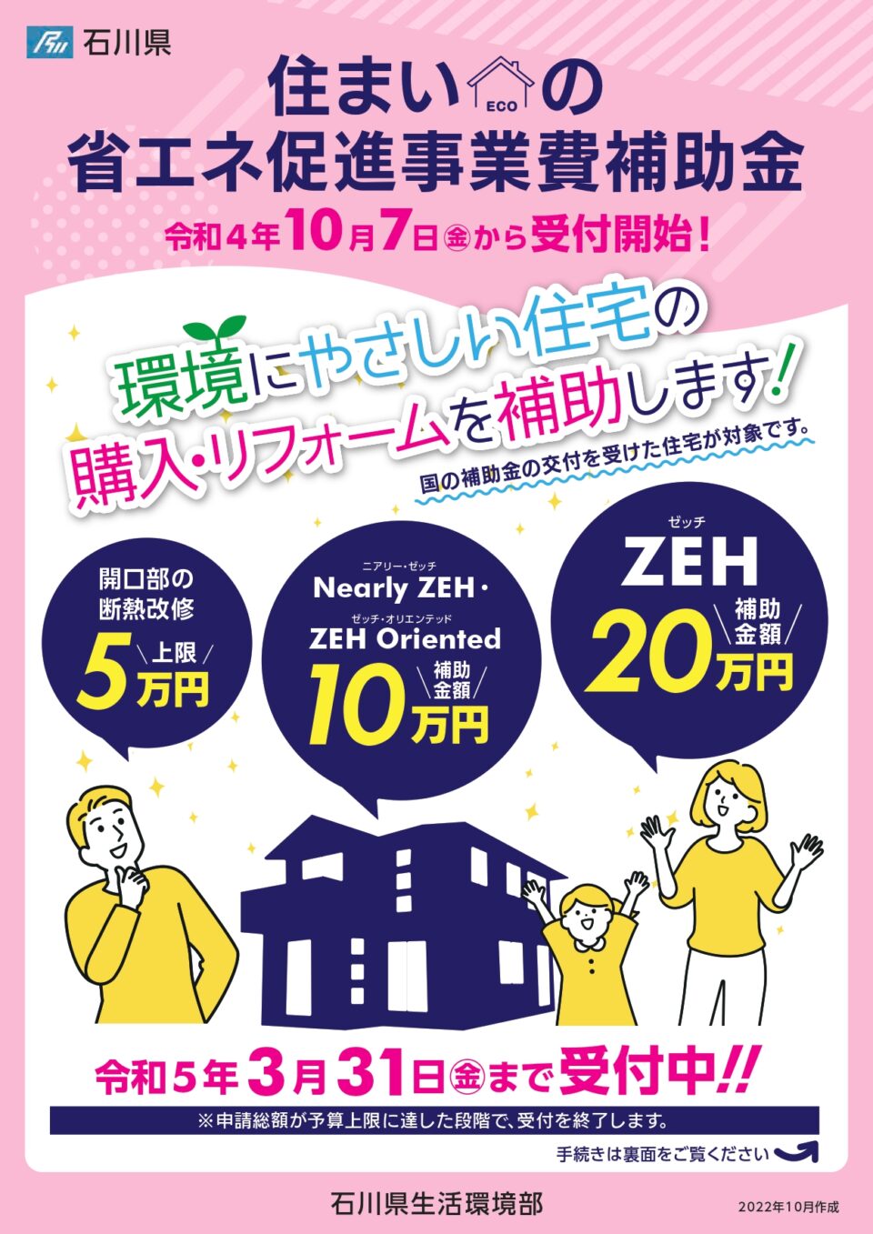 この制度を端的にいうと【こどもみらい住宅支援事業】関係で上記チラシに記載されている内容の工事をして、交付決定を受けたお家は県から補助金をもらえて、県から補助金をもらえて、県から補助金をもらえれば七尾市からも同額の補助金をもらえるとの事。