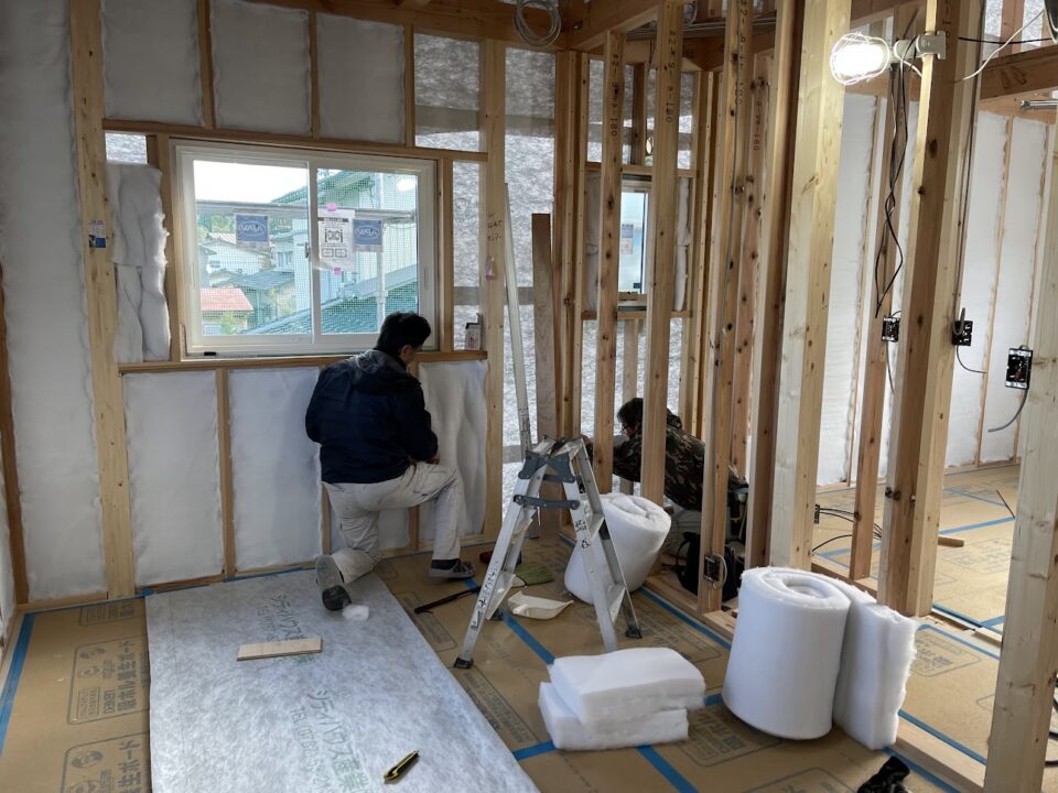 ちなみに断熱材はパーフェクトバリアというポリエステル系のものを採用しています。この製品はコスパも良いので長い事採用しています。大工さんも手慣れた手つきで柱間に充填していました。