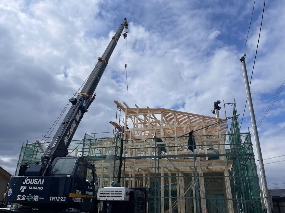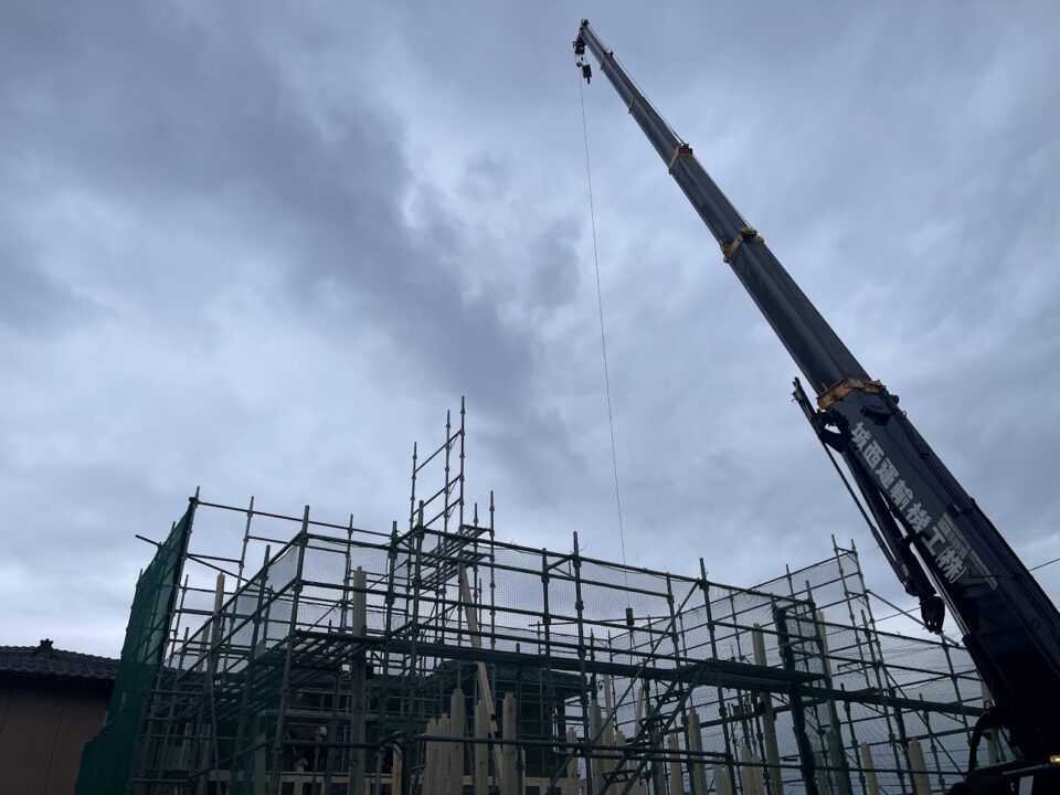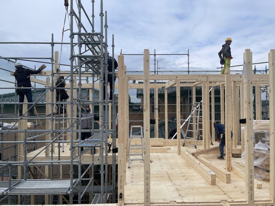 おっと、話は変わりますが、昨日は大工さん9人での作業。お家の大きさも40坪弱と最近の担当物件にしては大きめだったので、いつもより時間かかるかな?と思うもどんどん柱が建っていき作業は進んでいきます。