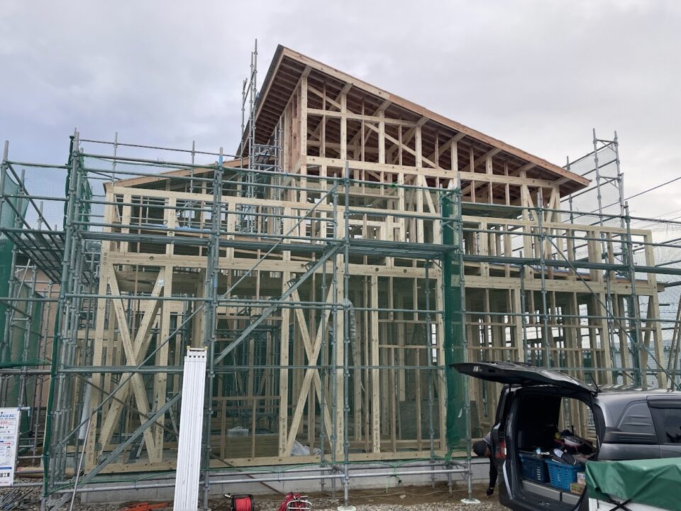 お昼前。屋根の骨組みが施工されて、だんだんカタチになってきました。