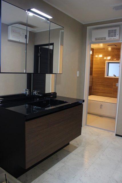 お風呂は一日の疲れを癒す大切な空間。ゆったりと過ごせるように大き目の浴槽とテレビを設置しました。テレビに限らず、本を読んでもよし、スマホでゲームやSNSを楽しむのも良いですよね♪また、洗面脱衣室も快適に利用できるように暖房乾燥機を設置しました^^