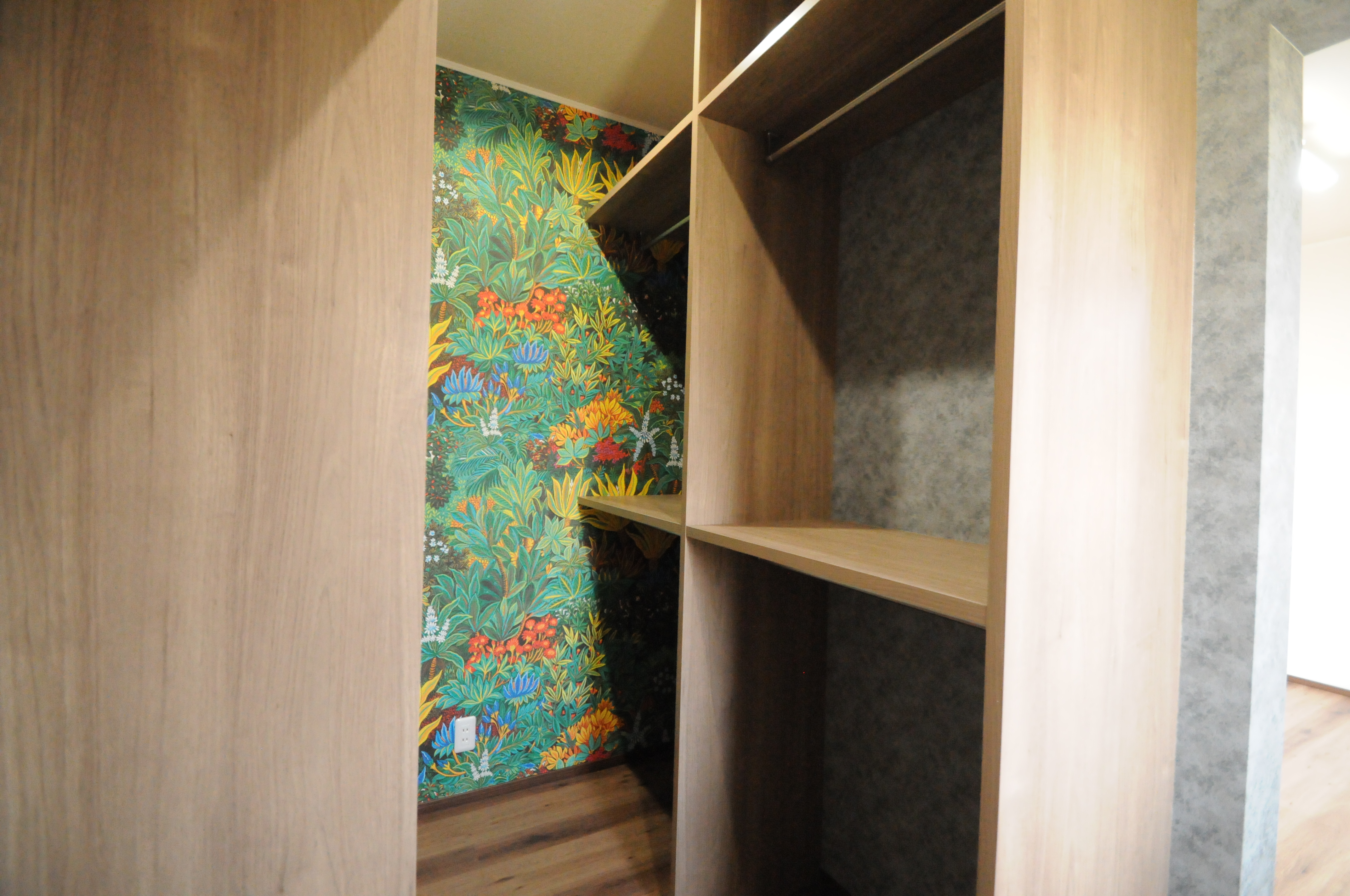 K様自身も「ちょっとウォークインクローゼットの壁で遊んじゃった♪」っておっしゃる程の壁紙を張られた寝室のウォークインクローゼット(笑)