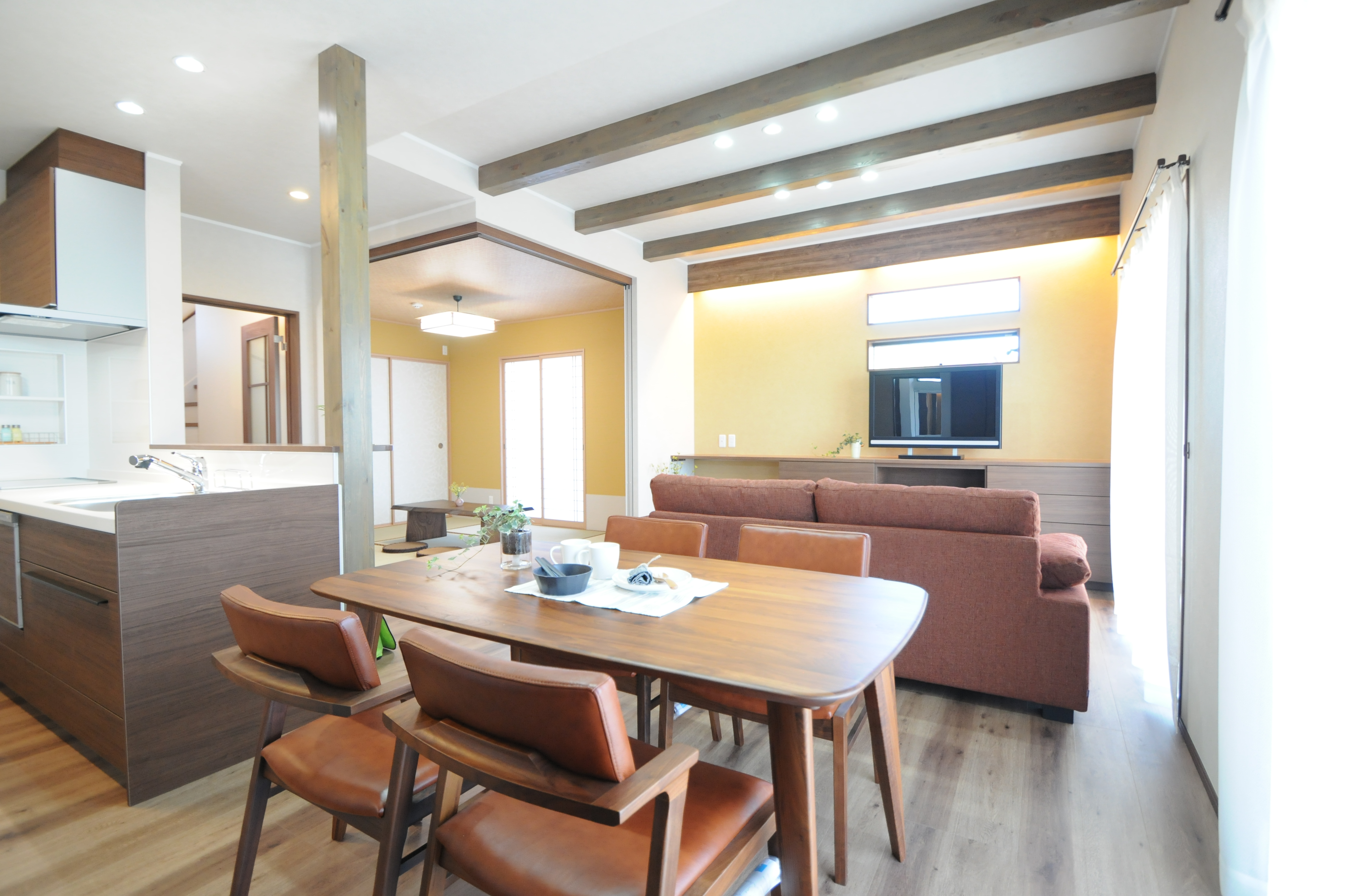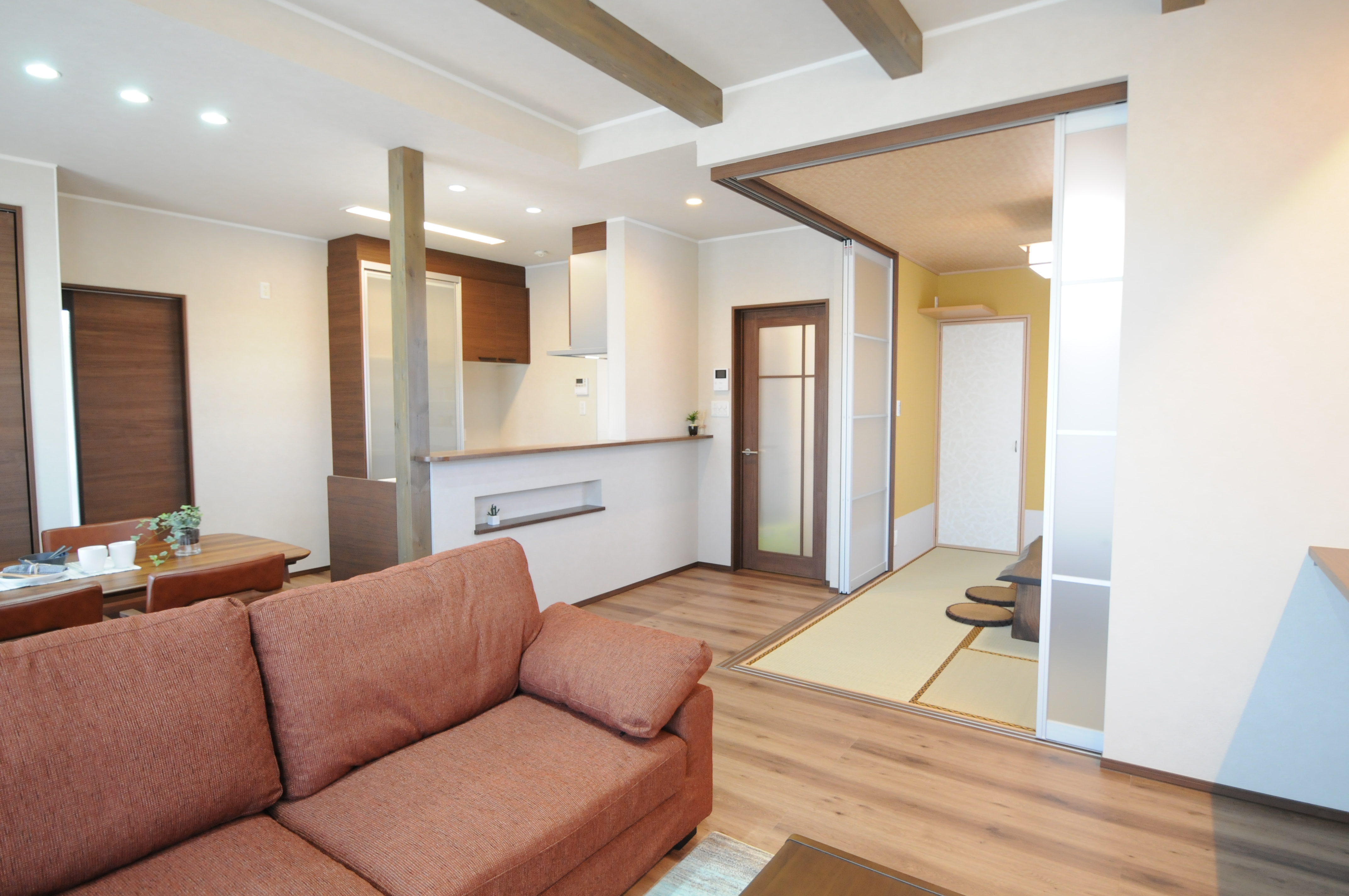 廊下からLDKに入ると左手前に和室、前方にはLD(リビングダイニング)が広がり、右手にキッチンという配置にしました。