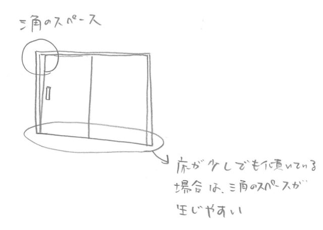 上の図は極端ですが、床がわずかでも傾いているとこのように三角のスペースが出来てしまいます。これは大工さんが悪い訳ではなく、基礎の仕上がりも影響してくるという、とても厄介な問題なんです(汗)ちなみに、家の傾きで欠陥として認定される基準がありまして、その基準よりも大幅に傾きが少なくてもこの症状は出ます。(そんな場合は戸自体の調整で対処出来ますが、閉めた時に隙間が出来ないように調整すると、開いた時に反対側の方で三角のスペースが出来てしまいます(汗))