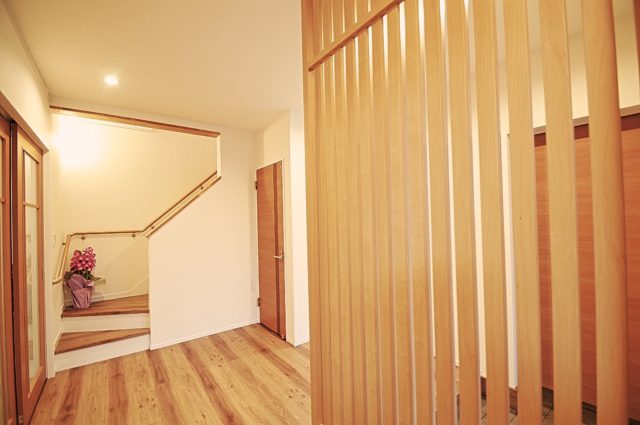 暖か味を感じる光(電球色のダウンライト)がお客様をお迎えする空間を柔らかく演出しています。和室への入り口の目隠しで格子を設置したり、帰宅してすぐ手を洗えるように洗面台を設置する等の工夫もされています。