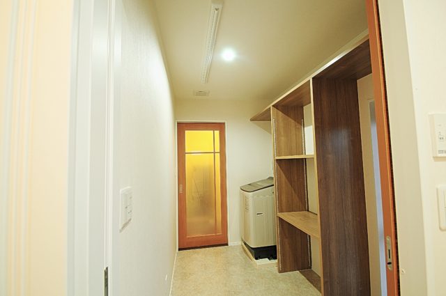 洗面脱衣室と隣接する家事室。ここから外部テラスへと出入りも出来るし、キッチン横に設けられた土間収納へも繋がっていて、とっても便利な動線を確保しました。