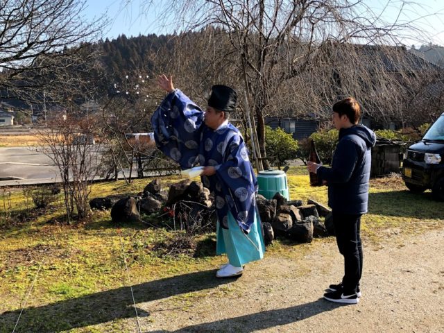 まずは神主さんが祭壇に大地主(おおとこぬし)の神様をお呼びして祝詞を奏上します。