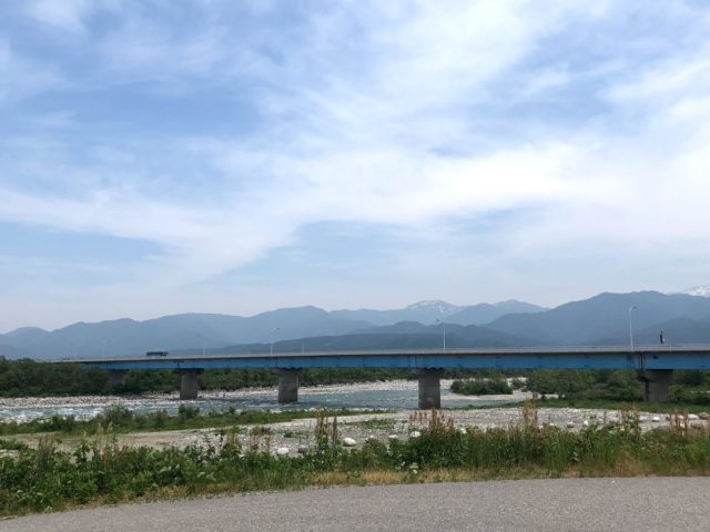 黒部川に到着。川向こうに見える山々がとても綺麗でした♪