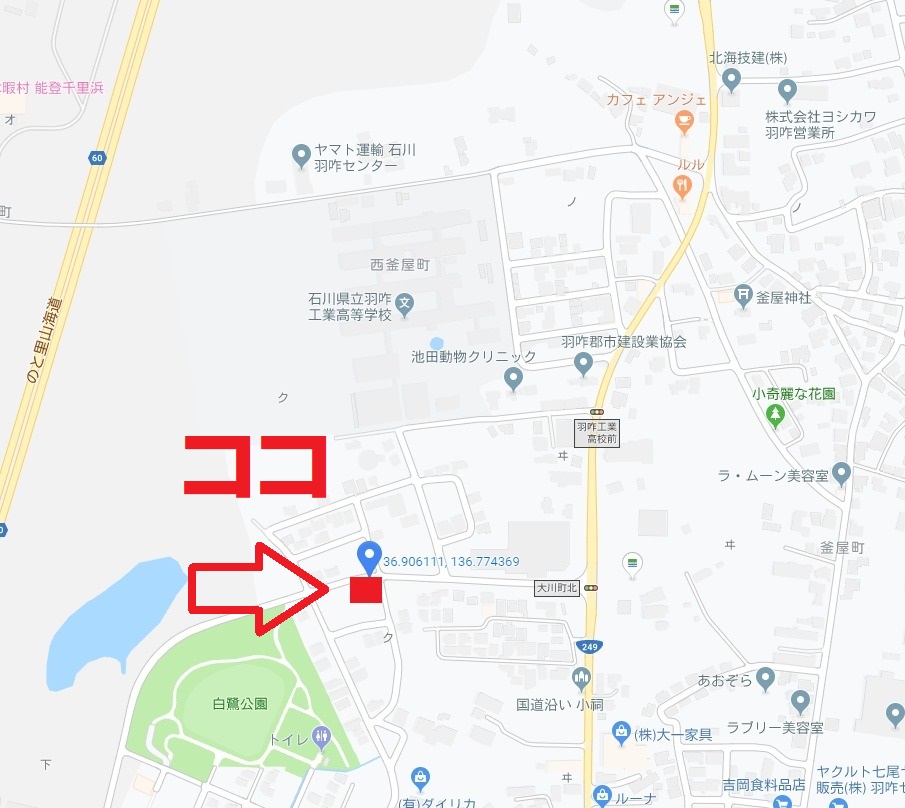 (グーグルマップの目的地に 36.906116, 136.774347 の数字を入力してもらえば近くたどり着けます)