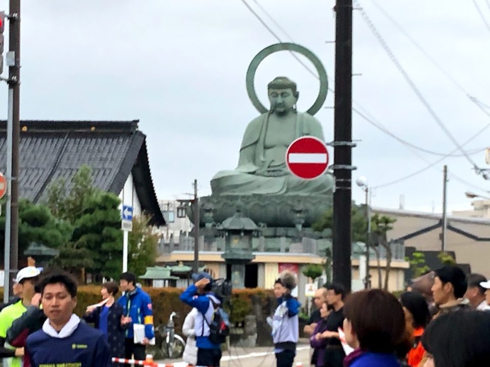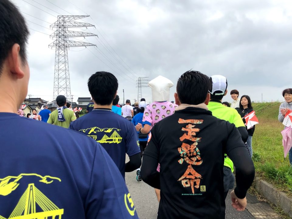 直線を折り返して、射水に別れを告げて富山市(ゴール)へ向かいます。ひたすら田んぼの真ん中を走るのですが、万葉集?の関係か昔の衣装をまとった方々が沿道で応援してくだっさたり、馬に乗ってました(笑)