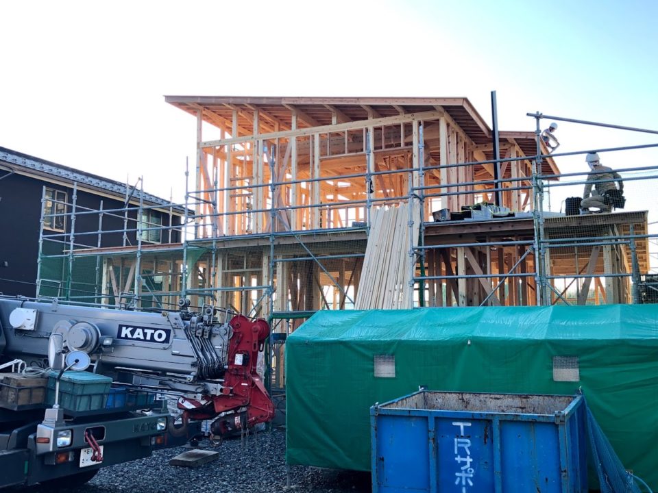 朝出勤前に立ち寄ったS様邸。屋根の上にいるのは大工さんではありませんが、昨日一緒に飲んだ大工さん2名がこの現場にいらっしゃいます。