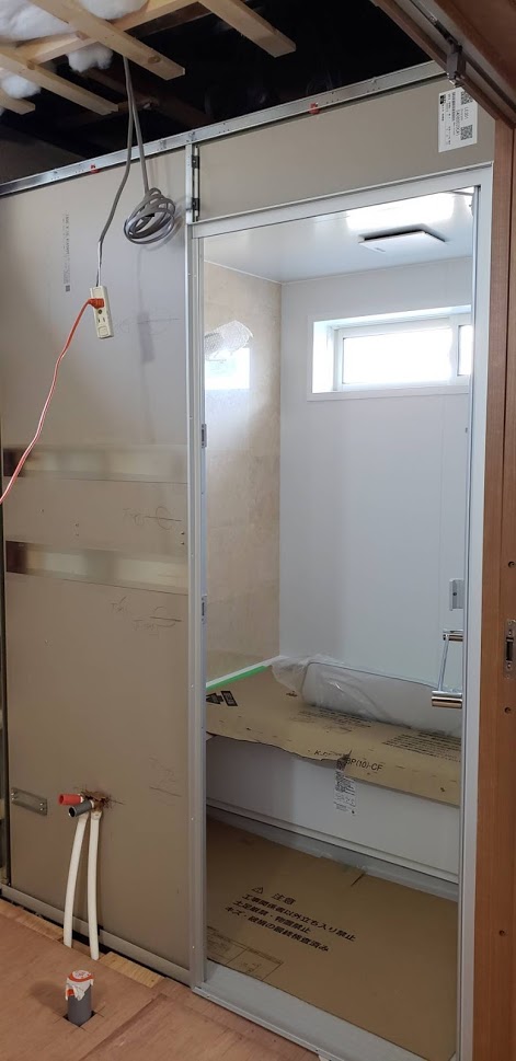 新しい洗面脱衣室が形どられていき、電気業者さんが配線工事をしています