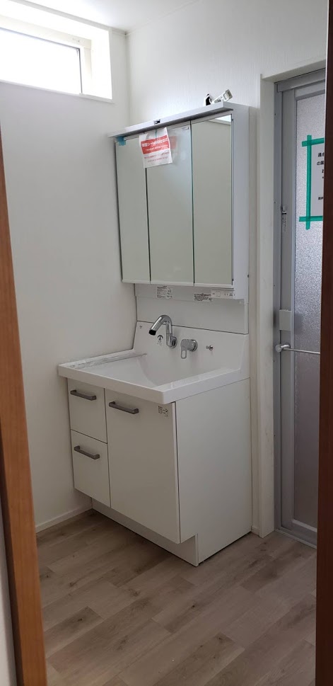 内装工事を終えて洗面化粧台を設置して完成♪うん、清潔感のある気持ち良い白い空間になりました^^