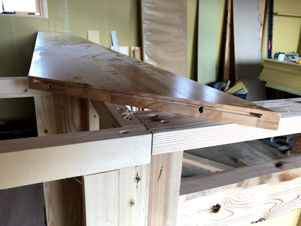 後は組み立てるだけの状態にまで工場で加工されてきたカウンター。しっかりジョイント部分が加工されているし、ボルト施工用の穴まで開いてます。スゲー。