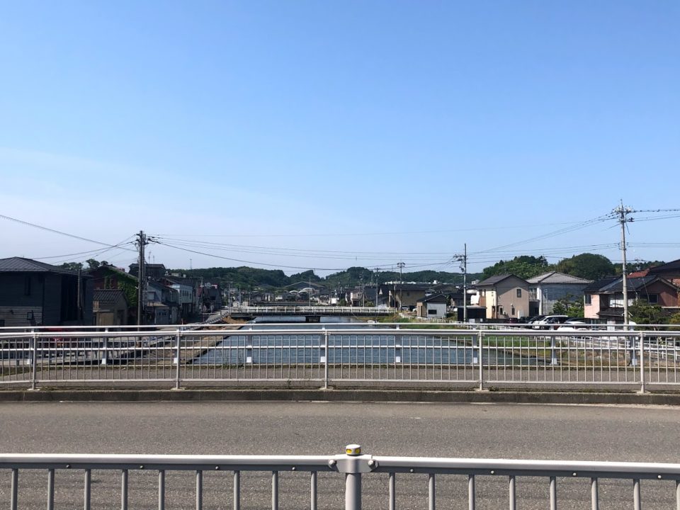 桜橋から眺める七尾の街並み。奥には美術感や総合体育館、武道館があります。