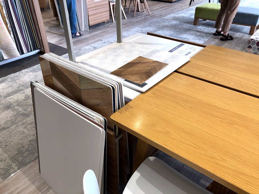 内装打ち合わせには各種造作カウンターや各種造作、室内建具、床の色をイメージして行います。部分的に見て決めるのではなく、空間全体をイメージしてもらいながら品番を決めるのが内装材選択で失敗しないコツかな?と思います。