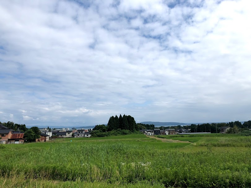 農免道路から見える田園風景とその奥に見える七尾湾と能登島