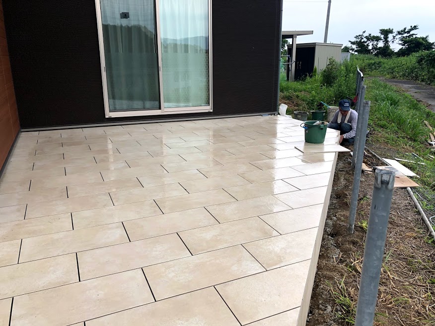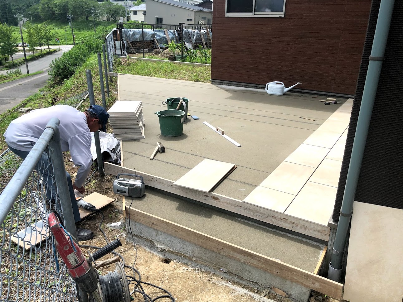 さて、約5年前にご建築くださったお客様宅ではタイルテラスを施工中です。新築時に「このスペースにウッドデッキとかタイルテラスを作れるといいですね〜」とお話していた事が実現しました♪