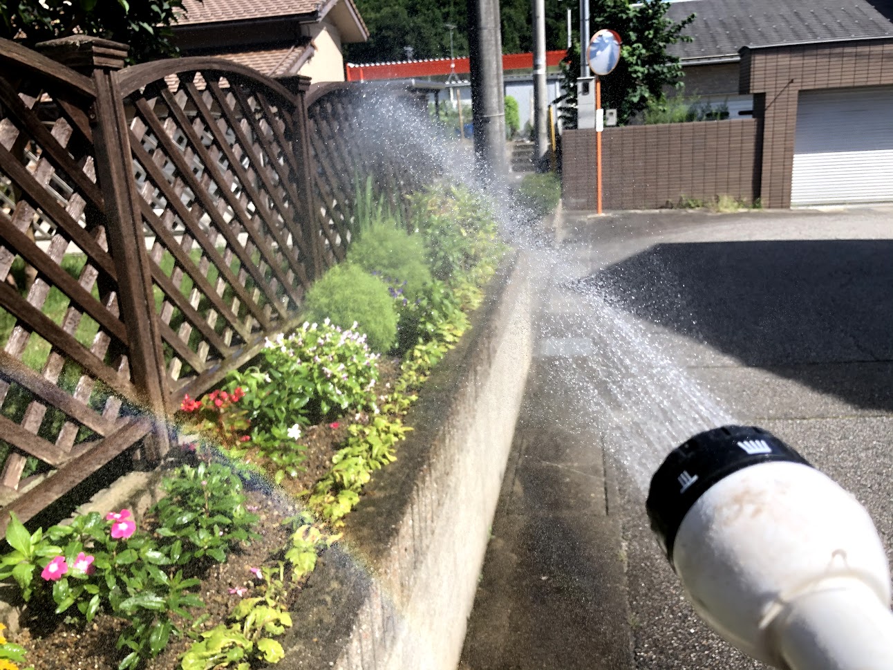 遅刻しててもお花たちと家庭菜園への水やりはかかせません。