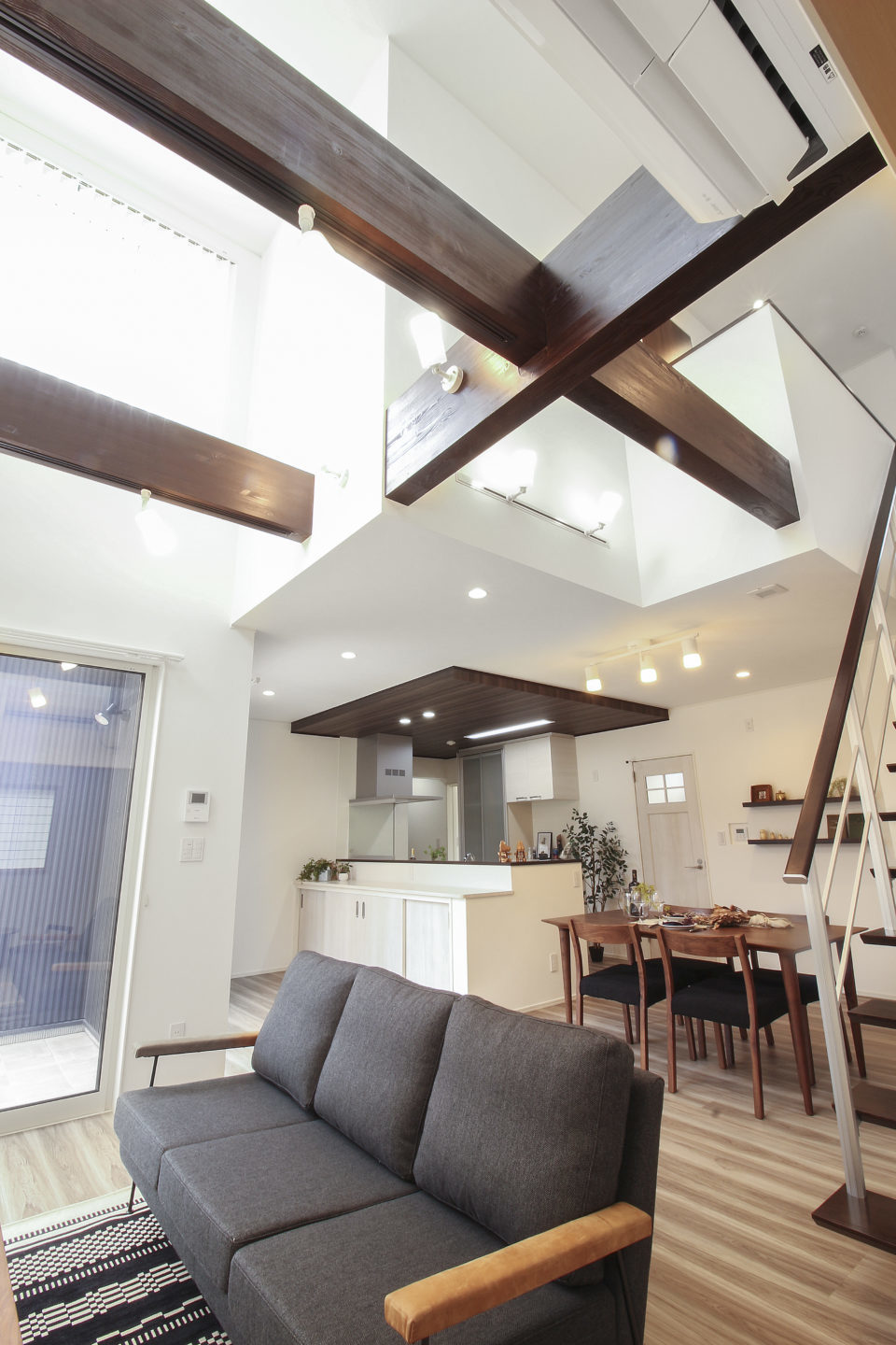 壁紙に合わせて窓枠や窓の内観色にホワイトを採用した事例(引用元: 家族のつながりを生む、吹き抜けのある家