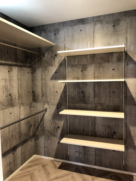 こんな収納の作り方とか、コンクリート調のクロスやヘリンボーンの床選定もいい感じに仕上がってます。