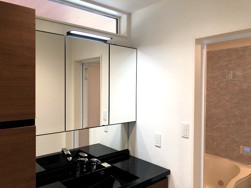 超絶格好良い洗面化粧台(LIXIL ルミシス)。お見積りで計上した洗面化粧台からかなりのグレードアップなのですが、「サービスさせて頂きました!」と堂下から聞いて倒れそうになりました。笑