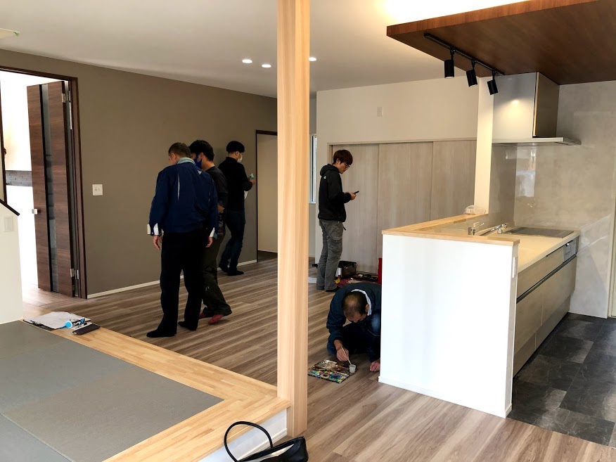 完成検査をしつつ、キズ等の指摘があったところはリペア専門業者さんに補修してもらっている図