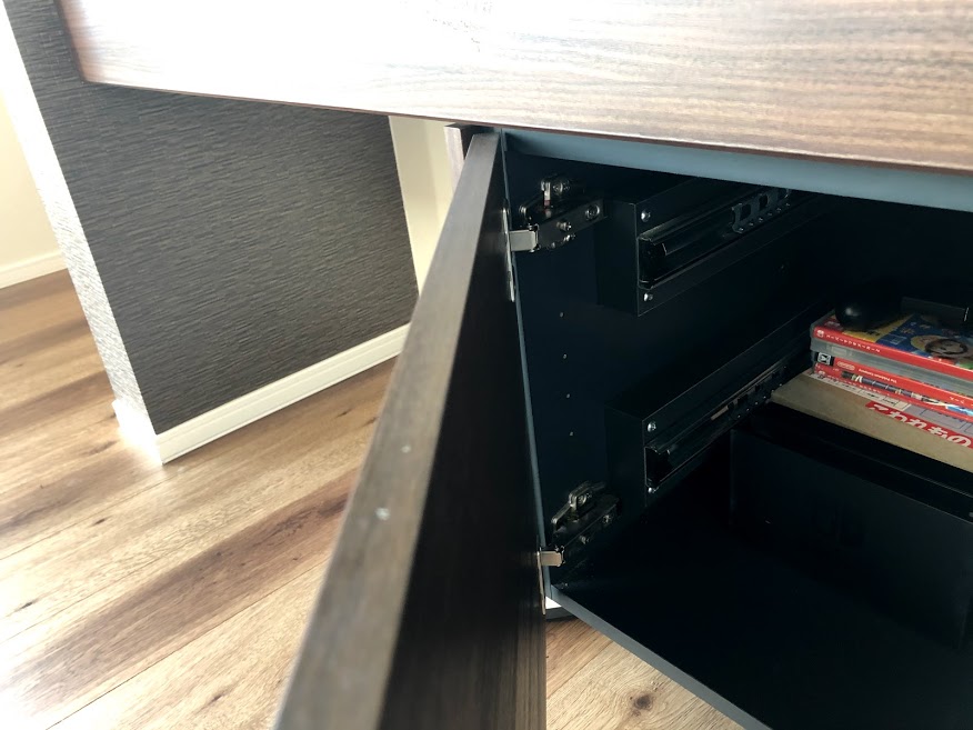 先日、お客様から「TVボードの扉がしまらなくなったので、直してほしい」とヘルプが入りました。ボクは自分で直せる自信がなかったので、堀下に依頼しようと思っていたのですが、部品が壊れていたりすると取り寄せないといけないし、まずは自分で見てみないとな〜と念のため工具をもってお客様宅を訪問。