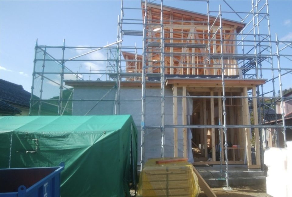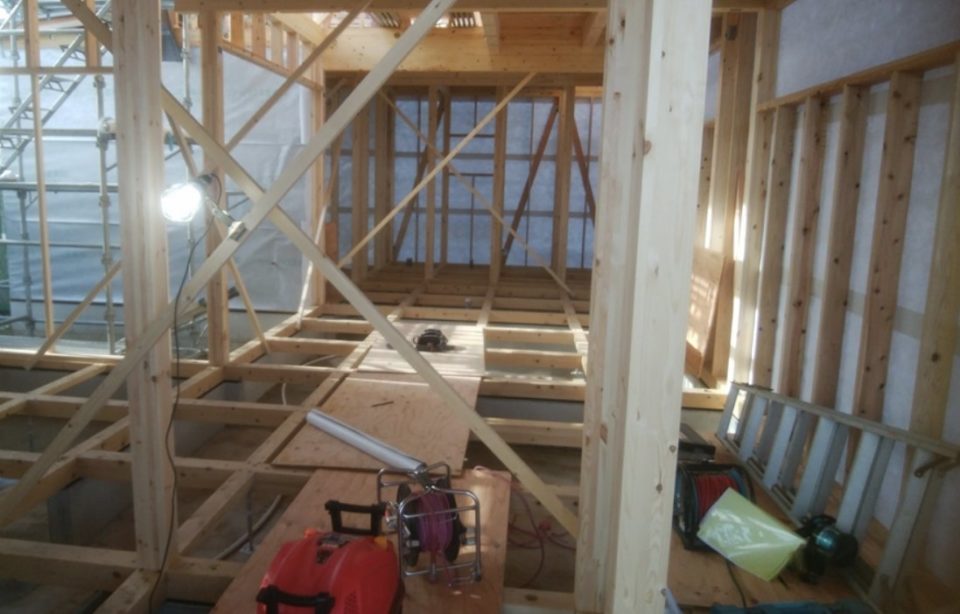 さて、今週の月曜日に上棟した中能登町I様邸は白アリ対策工事が行われて、屋根が仕上がり、大工さんが各種補強金物をつけたり、外部にグルっと透湿防水シートを張ってくれています。