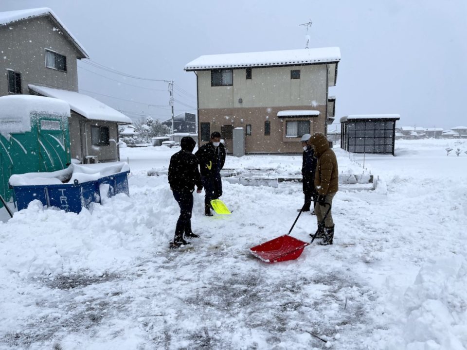 雪かき後、プレカット業者さんと搬入について打ち合わせをしている面々