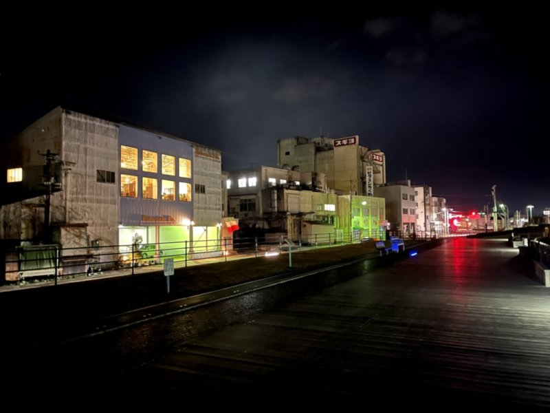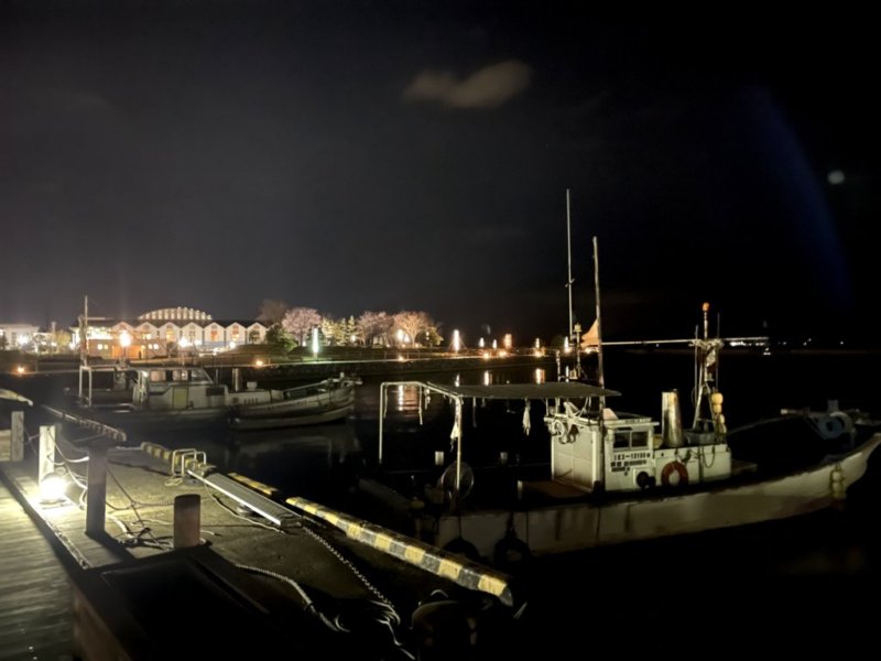 船の係留場越しに見えるマリンパークと能登食祭市場。なんとも素敵な夜景ですね〜♡