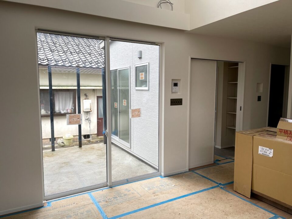 LDKの大きな窓から出入りできるところに中庭(タイルテラスですが、まだタイルは施工できていません)を設けました。このタイルテラスには沢山の工夫が詰まっています。