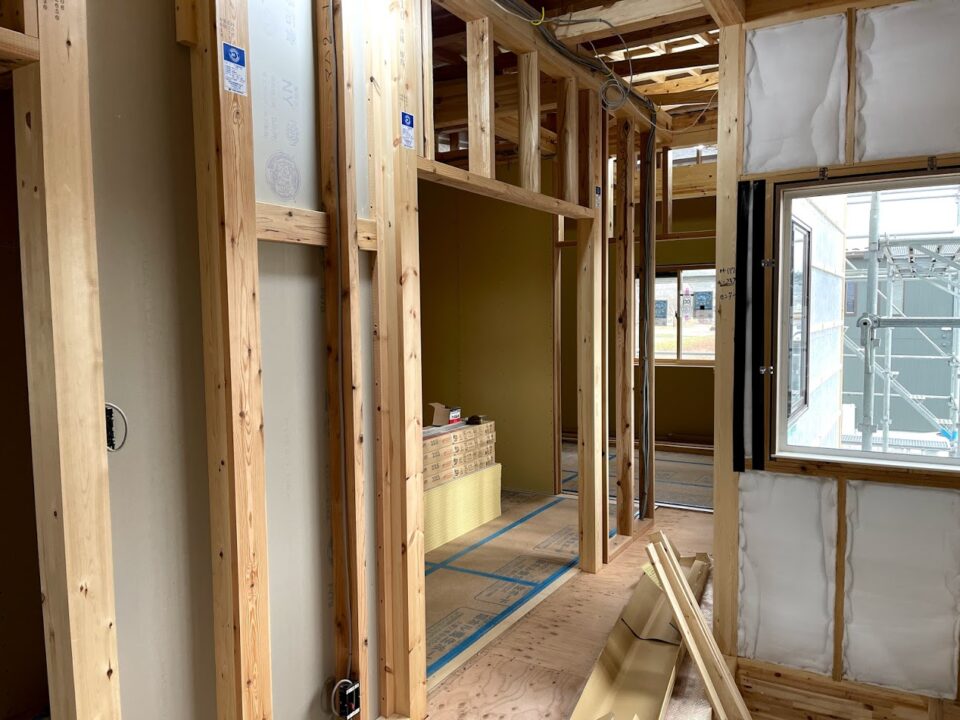 シティハウスの標準仕様は壁に下地をつくらず、直接柱に壁を貼っていく=直貼り工法を採用しています。これが良いとかどうとかは各社の考え方によって違うので言及はしませんが、少しでも外気との隙間をつくらないような配慮は欠かしていません。