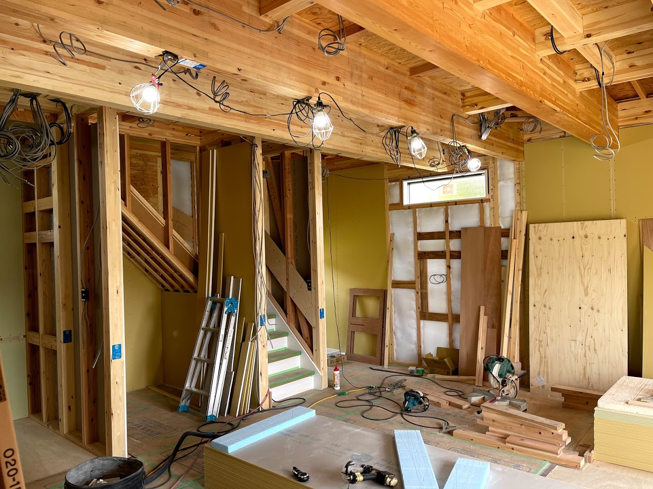 S様邸は外装工事が終了し、来週中には足場が撤去されて、外部配管工事が始まります。大工さんも来週いっぱいくらいかな?大工工事の後は空間をガラっと帰る魔法=内装工事が始まるし、仕上がりがとても楽しみです♪